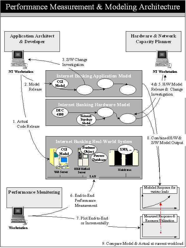 Enterprise Performance Management plans over time to enhance software development processes that incorporate additional activities for modelers, in concert with developers. For example, as new designs or changes are being considered, modelers with developers should build modeling modules before applications are implemented. The models predict how the new or changed applications will perform in the complete Internet Banking environment. The processes will also define how measurements (not provided by existing performance management) are made after the application is actually built to determine execution path-lengths through the code. These measurements are used to accurately parameterize the modeling modules. The processes define how final modeling modules are to be released at the same times that the new application components are released. New modeling modules are certified to accurately represent the new application components and are then added to a growing library of Wells modeling components.