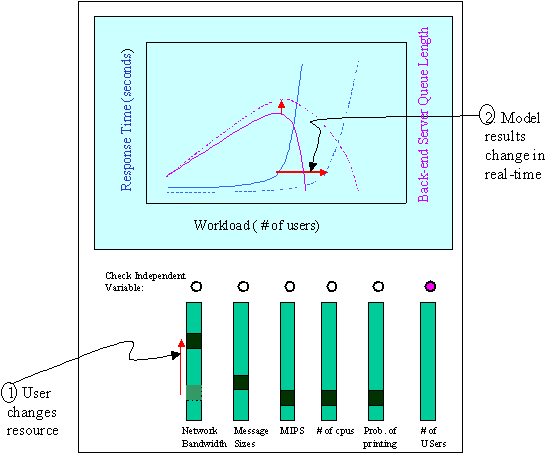 Our Java applet has a draw area where line graphs of performance curves are displayed. Multiple curves per display can be selected. Initially, we proposed slider widgets that would allow the applet user to increase or decrease modeling parameters and interactively see changes in the performance curves. For example, a network-bandwidth "knob" could be increased and the "knee" in the performance curve would be pushed-out, but only to a certain point. Then a CPU MIPS "knob" could be increased to further flatten the curve. This interactive experience would show users how bottlenecks can move around (from network, to cpu, to disk, etc.). As conceptually presented, the applet had a separate slider widget for each modeling parameter (See figure below). However, real-estate restrictions on the applet's GUI force us to use either scrollable panels of slider widgets or mode-sensitivity mouse "clicks/shift-clicks" for increasing/decreasing values.