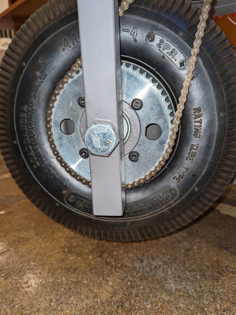 Here are images of the sprocket hub and assemblies with the 10″ pneumatic tire wheel and 55 tooth #25 chain sprocket.